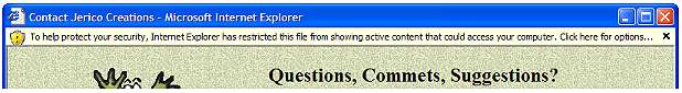 Site Security InformationPlease note that this site uses javascript to conveniently display information about the items that you're contemplating purchasing. In order to view this information correctly, your browser should be enabled to execute javascript.We at Jerico Creations certify that there is no security risk involved with visiting our website! You will not receive any unwanted content and no data is collected, other than what you provide in the process of submitting an order for merchandise. |